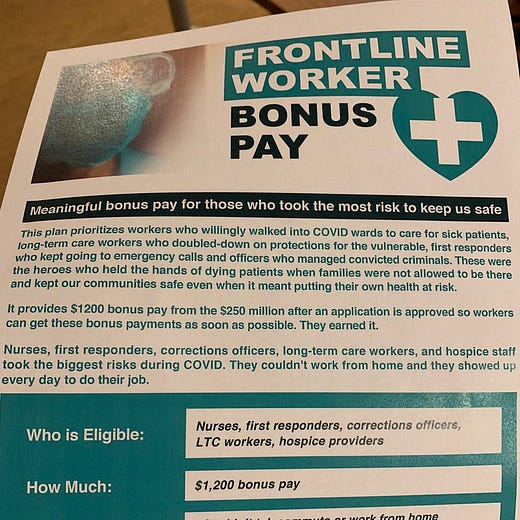 “The decision here is obvious,” said Rep. Neu Brindley. “There is a group of workers, those who worked in long-term care...these folks were assuming risk that other people just were not assuming. It behooves us as a legislature to acknowledge that.”