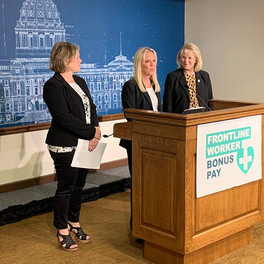 Senator Karin Housley, Representative Mary Kiffmeyer, and Representative Anne Neu Brindley of the Frontline Worker Pay Working Group, announced their proposal today for distributing the $250 million to frontline workers in Minnesota.