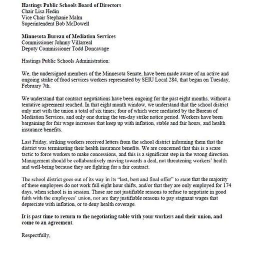 Food service workers in Hastings, Minn., school district are continuing their strike after receiving a letter from the school district informing them about the termination of their health insurance benefits.