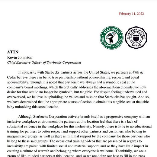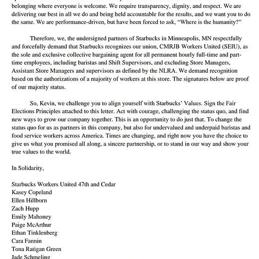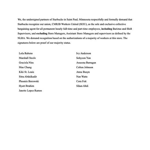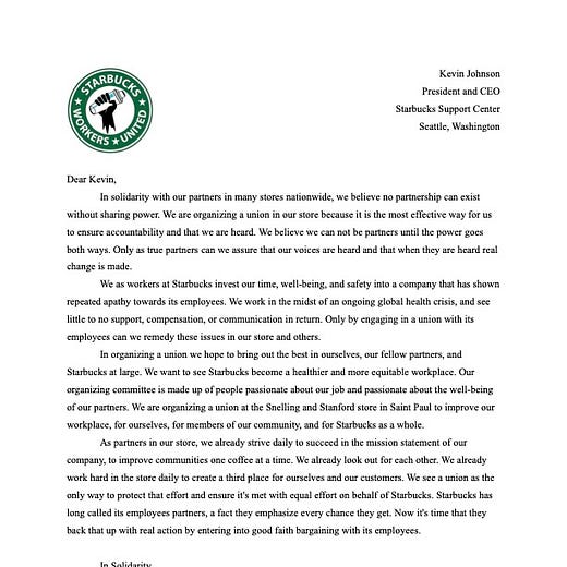 “We as workers at Starbucks invest our time, well-being and safety into a company that has shown repeated apathy towards its employees. We work in the midst of an ongoing global health crisis, and see little to no support…We want to see Starbucks become a healthier and more equitable workplace… We are organizing a union at the Snelling and Stanford store in Saint Paul to improve our workplace for ourselves, for members of our community, and for Starbucks as a whole.”