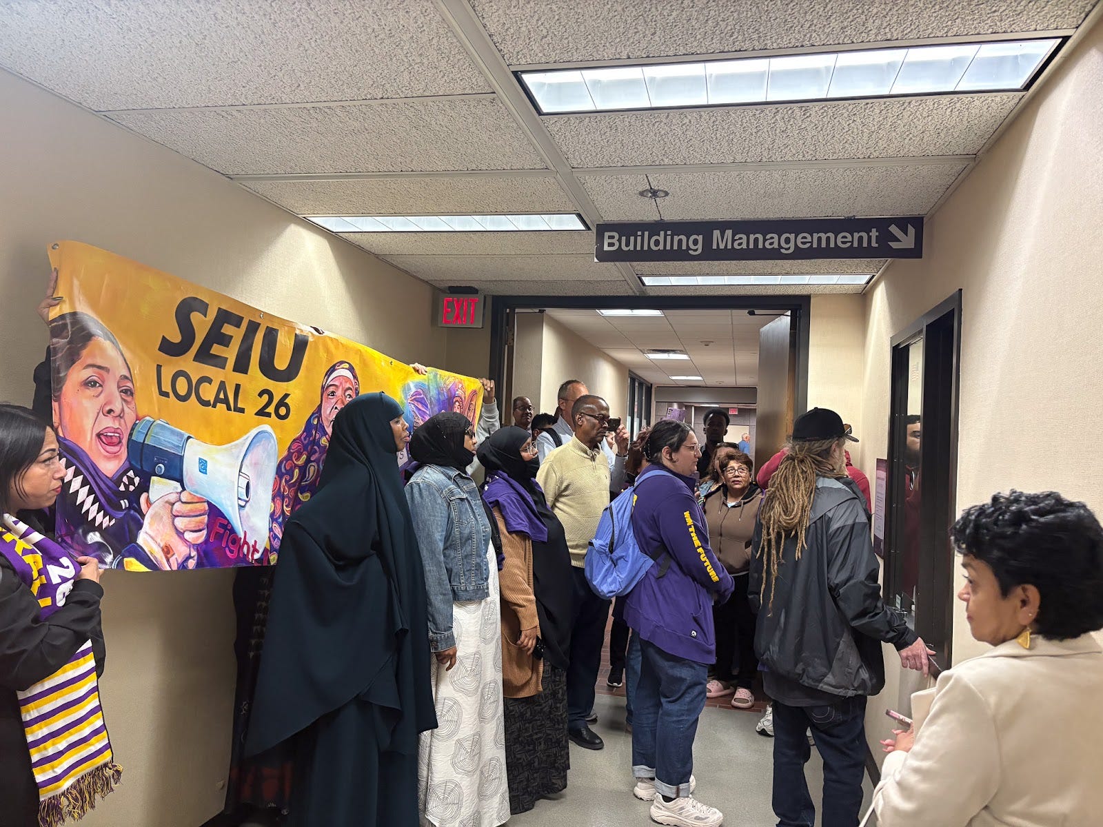 The morning of September 8, janitors represented by SEIU local 26 held a press conference outside the building where they worked, then marched together into the facility, where they delivered a letter to the office of Building Management demanding the workers be reinstated.