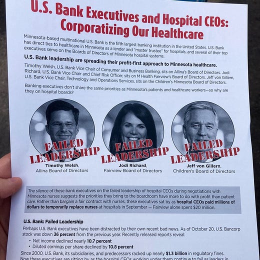 Last week, nurses rallied in front of the U.S. Bancorp headquarters in downtown Minneapolis before marching into the lobby, and then marched to the lobby of Wells Fargo. Several board members of their hospitals are also board members at U.S. Bank. This action came after the three day strike in September that garnered a lot of media coverage.