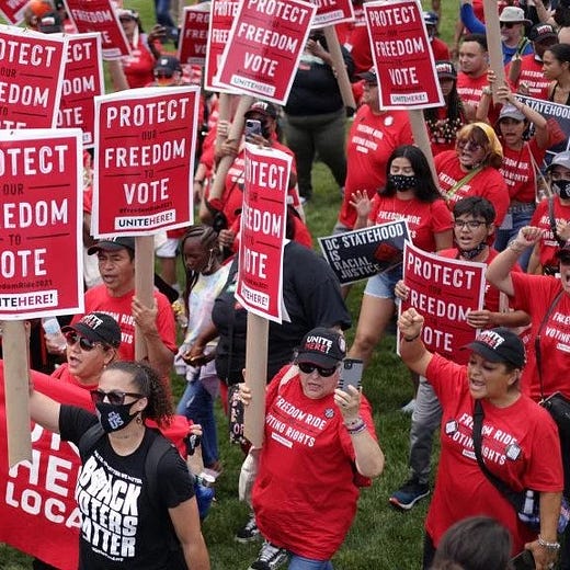 UNITE HERE hospitality workers recognize the democratic power of workers and have been holding rallies around the country to protect voting rights.